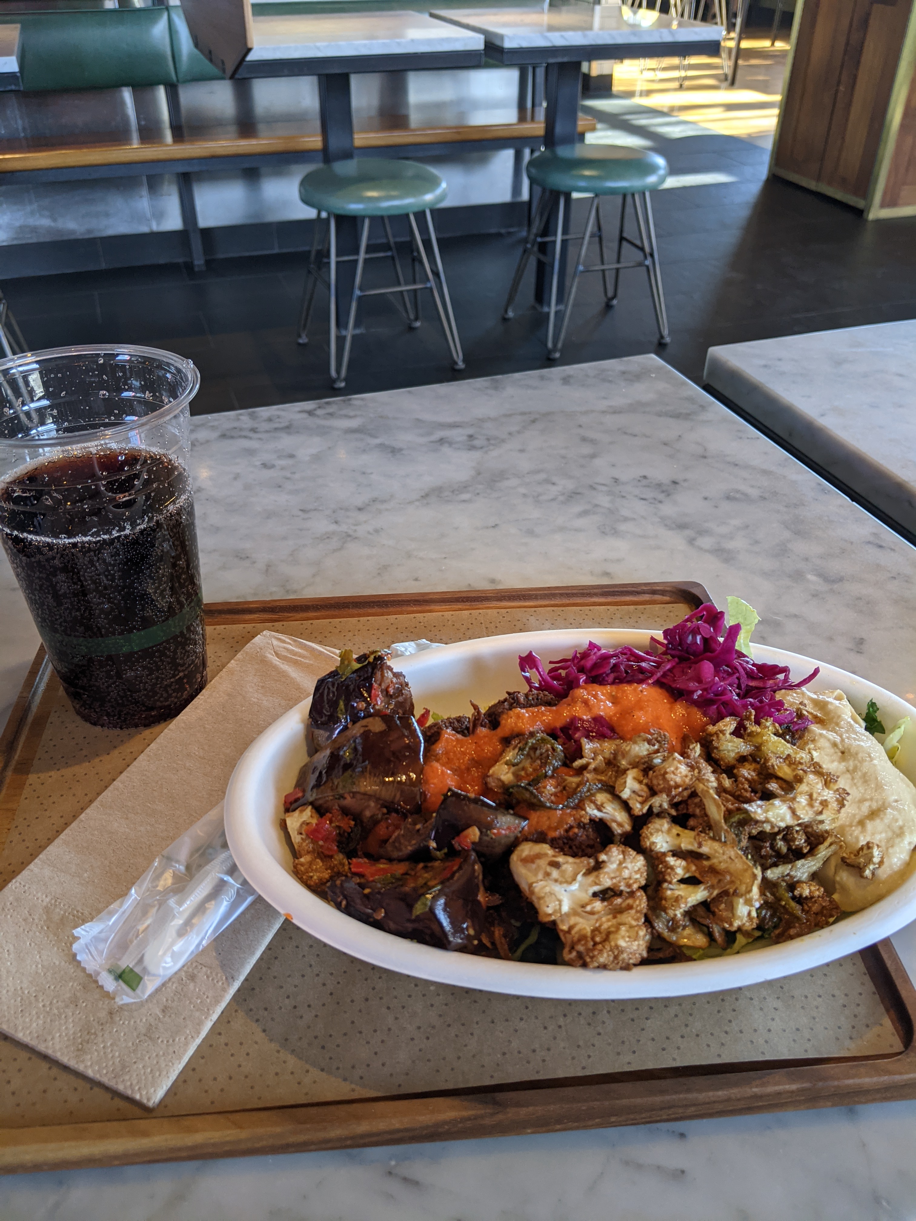 [A note about Brassica–I ordered the falafel bowl with veggies, hummus, and red pepper sauce. My tastebuds were in heaven with the complex tastes of this Mediterranean bowl. It was pretty pricy for a casual fast dining experience so I rate this place 8/10]