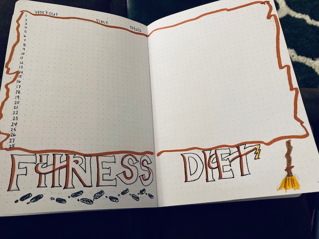 Inspired by the Marauder’s Map, I created a way to record my exercise and diet journey. These pages are a great place to track my progress toward my health goals. This is a functional spread, and probably my favorite this month.