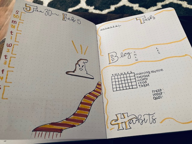 As usual, I used my weekly spread which is modified from the Plant Based Bride’s Rolling Weekly spread. The colors used on this page align with the Gryffindor house colors. I also drew a picture of the Sorting Hat, and I plan to carry on the Harry Potter theme with the house colors for the remaining weeks of the month.